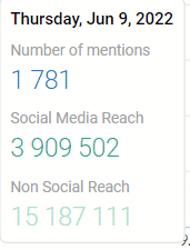 Podemos observar que hay un repunte el mismo día 9 de junio donde las menciones sobre este asunto se desbordan en las redes, principalmente en Twitter con un total de 12268 menciones entre el periodo analizado que es desde el 5 de junio hasta del día 17 del mismo mes.