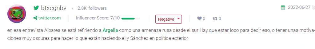 Como hemos señalado anteriormente, el día 9 de junio, cuando el gobierno del Sáhara anuncia que endurecerá las limitaciones sobre España en materia energética, es el día que más impactos se generan en redes sociales en relación a esta asunto. Así pues, sobre un total de 1781 menciones del término «Argelia» se produjo un alcance en socia media de 3.909.502 .