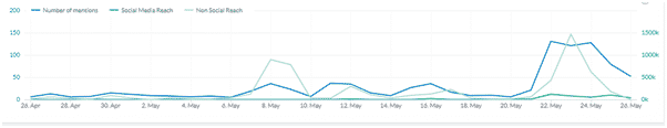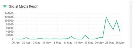 Según muestran los dos gráficos anteriores, podemos observar como a partir del jueves 20 de mayo se empieza a hablar del Atlético de Madrid en cantidades mayores que durante los días anteriores. Quedaban dos días para el día decisivo, y la gente ya estaba en modo On con la mente puesta en el partido entre el Valladolid y Atlético. Como no podía ser de otra manera, el 22 de mayo, que es el día en el que el Atlético salió campeón es donde el gráfico indica el pico más alto de alcance diario y de menciones. El alcance diario marca los 121.231 puntos, coincidiendo con una avalancha de diversos perfiles y personas accediendo y difundiendo contenido sobre el Atlético, el reciente campeón. En total, se han encontrado 913 menciones y 29k interacciones durante el periodo seleccionado en el gráfico. De esas menciones, la mayoría se concentran en Twitter, y bastante por debajo, en vídeos realizados sobre lo que fue el partido y las celebraciones. Tras el final del partido la gente se echó masivamente a las calles de Madrid a celebrarlo por todo lo alto, olvidando incluso que estamos aún en plena pandemia, pero la pasión y la locura que genera el fútbol ha vuelto a demostrar que hace olvidar por unas horas que estamos todavía en situación de emergencia sanitaria.