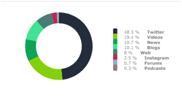 En este gráfico podemos corroborar visualmente como se reparten las menciones por categoría, o más concretamente por canal o aplicación. Twitter recoge el 48,3% de las menciones al Atlético de Madrid, seguido de lejos por la categoría de Vídeos con 19,4% y de Noticias con un 10,7% del total. Una vez más, vuelve a ser evidente que cualquier acontecimiento sobre actualidad instantánea es seguido mayoritariamente en la red social de Twitter.