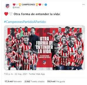 En primer lugar, el tuit que publicaba el perfil Twitter del propio Atlético de Madrid nada más finalizar el encuentro en Valladolid, lograba 17,9 mil Retuits, 59,9mil Me Gusta y 2562 tuits citados. En estos casos los clubes, suele ser habitual que publiquen una foto haciendo gala de su plantilla al completo, y con un lema del club, en este caso Otra forma de entender la vida, lema que llevan escrito los colchoneros en sus entrañas. Por otra parte, también se puede ver el hashtag #CampeonesPartidoAPartido, el lema que el Cholo Simeone implantó nada más llegar al club, y que se ha convertido en un lema para la vida.