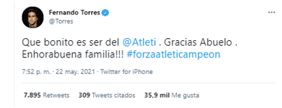 Otro de los tuits que más repercusión tenían era este de Fernando Torres nada más concluir el partido. Torres es conocido como leyenda y patrimonio del club, además de un incondicional «enamorado» de su Atlético de Madrid. En este tuit agradece a su abuelo por haberle inculcado lo que es ser de este club, y por haberle pasado su pasión. Fernando Torres es una figura importantísima dentro de la familia colchonera, y vemos como su tuit consiguió 7.895 retuits y hasta 35,9 mil Me gusta.