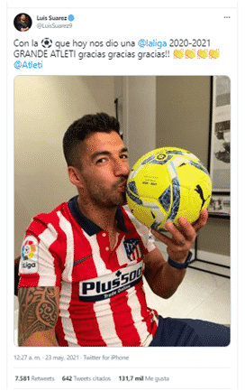 Sin ninguna duda, el protagonista de la Liga lograda por el Atlético es Luis Suárez. El uruguayo logró los dos goles más importantes de la temporada ante Osasuna para remontar y ante Valladolid para lograr el campeonato. Pero no sólo por su influencia directa en la consecución del trofeo, Luis Suárez dejó una imagen inolvidable llorando en el césped, descargando sus emociones. Y es que como podemos ver en el tuit, estaba realmente agradecido al Atlético por incorporarlo tras su salida del Barça como descarte, y que el mismo Suárez se sentía «menospreciado y dolido». En el Atlético sintió ese cariño, y en forma de goles se lo devolvió a la afición. Suárez ha conocido esta temporada todo ese sufrimiento que conlleva pertenecer al Atlético de Madrid. Este tuit con una foto besando el balón del partido en Valladolid con la camiseta del equipo, logro una brutal cifra de 131,7mil Me gusta y 7.581 retuits. Pocas personas en ese vestuario desbordaban de felicidad como lo hizo el delantero uruguayo.