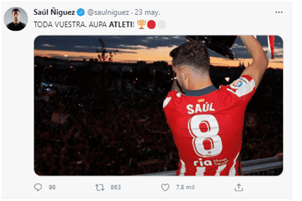 Para dar por finalizado el análisis de los tuits más relevantes del logro del Atlético de Madrid, concluimos con el tuit de Saúl Ñíguez, uno de los jugadores más queridos del club por la afición. Aquí aparece ofreciendo el trofeo a la afición en la celebración que hubo en el Estadio Wanda Metropolitano, y este tuit lograba 7,8mil Me gusta y 863 retuits. Saúl es otro de los tantos sufridores natos dentro de esa plantilla, que esta temporada ha tenido que trabajar duro al no haber estado tan destacado como otros años, y al haber arrastrado lesiones.