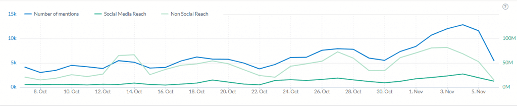 Como se puede apreciar en la gráfica adjunta, el desarrollo de las menciones a lo largo del último mes ha ido en crecimiento hasta superar las cien millones de interacciones, una absoluta barbaridad.