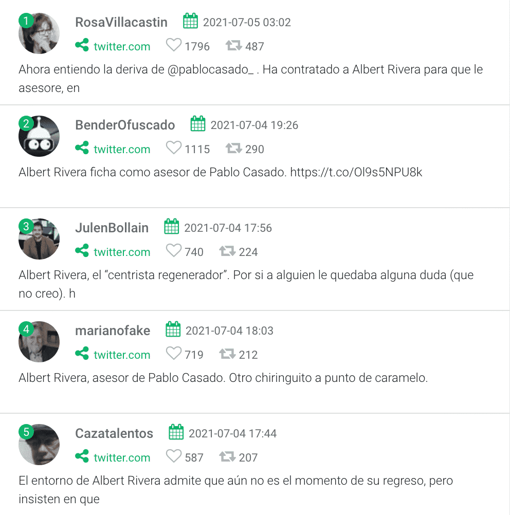 En el primer puesto está el tuit de la cuenta Rosa Villacastín (@RosaVillacastin), periodista, mayormente conocida en el mundo de la prensa rosa, y escritora, que consiguió 2734 likes, 709 retweets y 25 citados. En él criticaba la jugada de Pablo Casado y afirmaba que había contratado a Albert Rivera para asesorarlo en “agradecimiento por volar Ciudadanos”. Y añadía una última coletilla: “Qué falta de dignidad tiene quien fue el niño bonito de los prohombres del IBEX”. Recordemos que en muchas ocasiones se ha insinuado que el partido naranja fue creado, además de por intelectuales, por empresarios del IBEX-35.