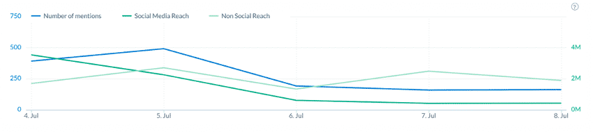 Es llamativo observar cómo en un solo día (del 5 al 6 de julio) los números cayeron en picado. De hecho, el total de menciones que se producen el 6 de julio es de 191 y un alcance de algo más de 600.000, nada que ver con el día anterior.