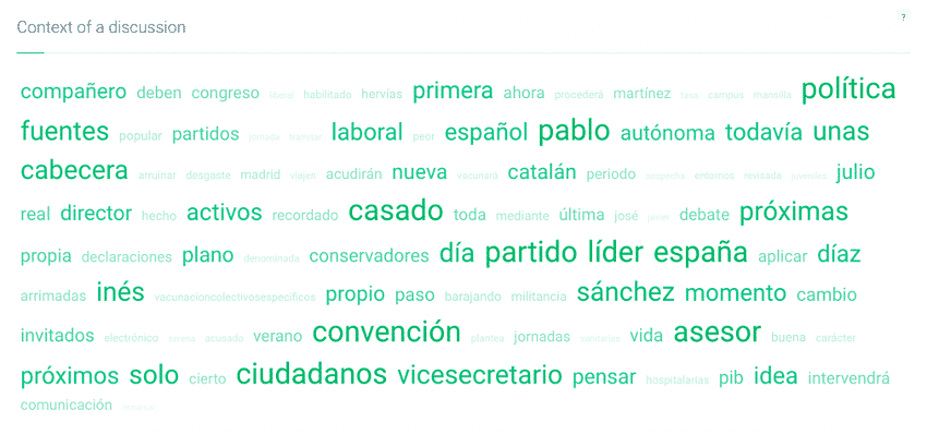 Entre los temas más hablados alrededor de este tema durante ese período analizado observamos cómo destacan palabras como “política”; “cabecera”; “convención”; “ciudadanos”; “asesor”; “casado” o “próximas” (en referencia a las próximas elecciones). También aparece “vicesecretario”, ya que Pablo Montesinos, vicesecretario de Comunicación del PP, tuvo que salir a desmentir el 8 de julio en una entrevista en RNE que no era cierto que Albert Rivera fuese asesor del Partido Popular y que no hay “ningún tipo de relación laboral en ese sentido”, aunque las relaciones entre ambos políticos de forma personal son buenas.